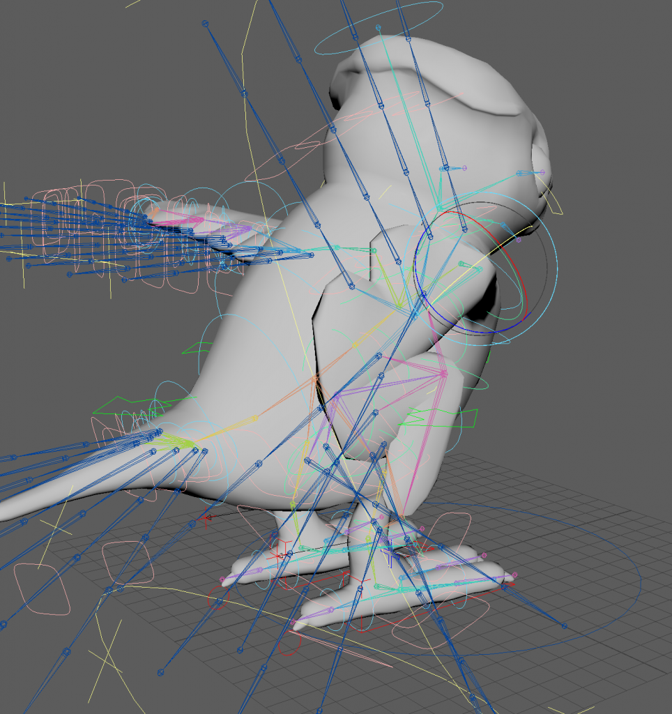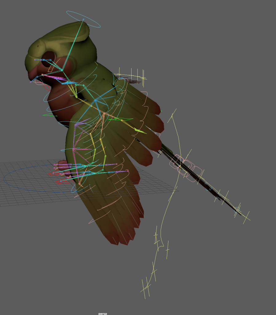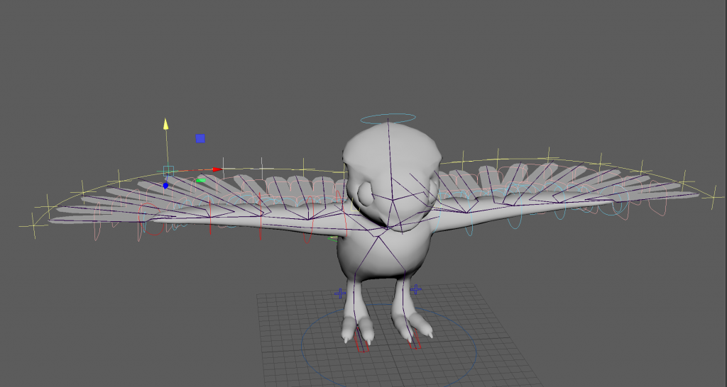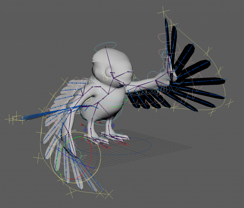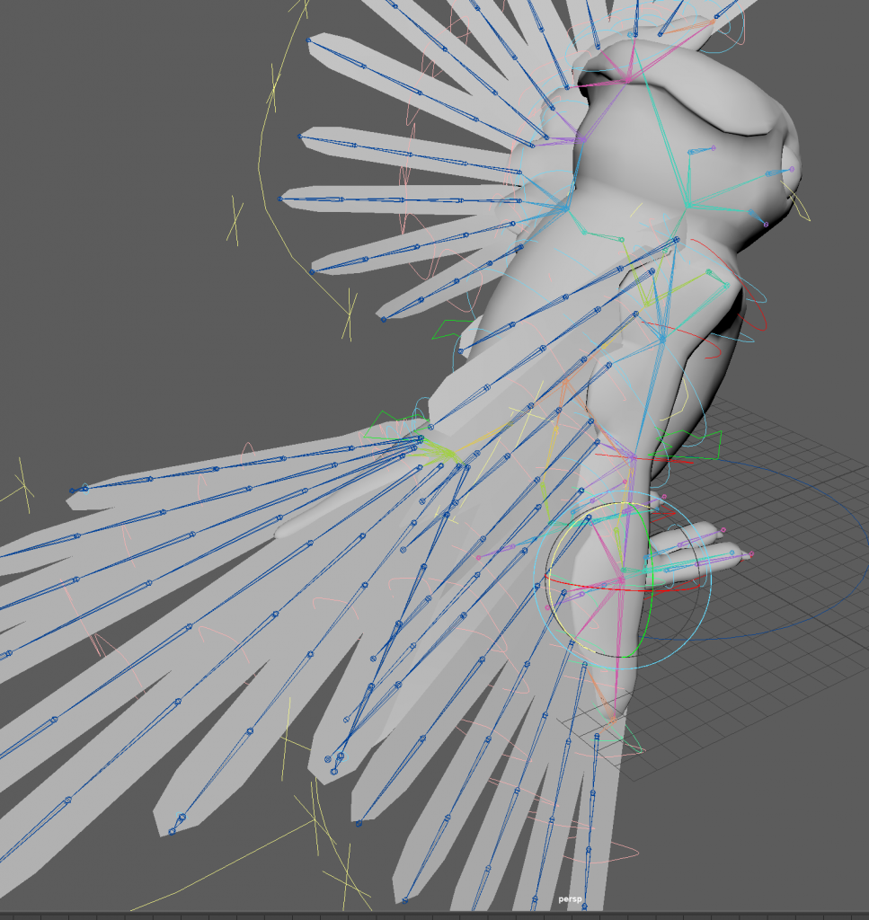 with weight paints, some feathers go through the mesh because i made them overlap too much. this is something i will avoid for the bird meshes in the project. advanced skeleton curve guide attribute combined with the twist/ bendy attribute for the wing feathers is a good combination and i think i could use it for long fur and clothing as well.
