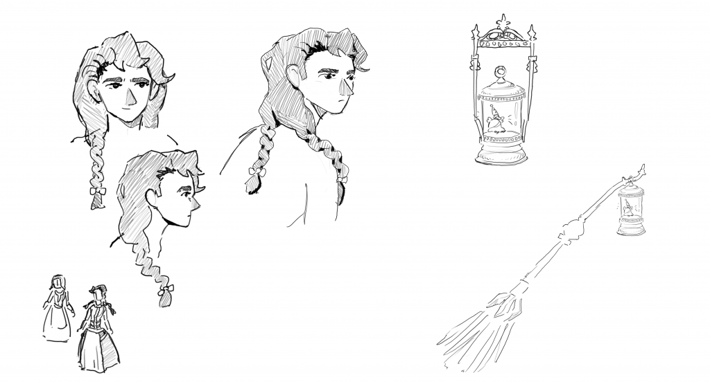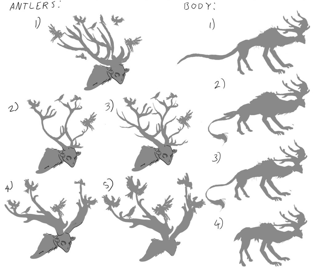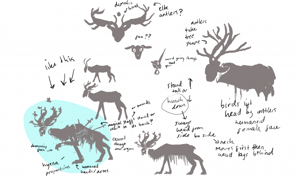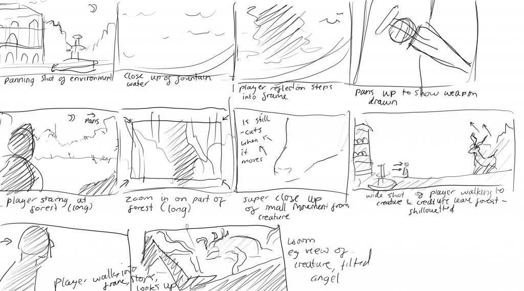 my rough storyboard for the cutscene. this helped me decide which elements would be needed in the final outcome, including the fountain, weapon, forest, player, and creature